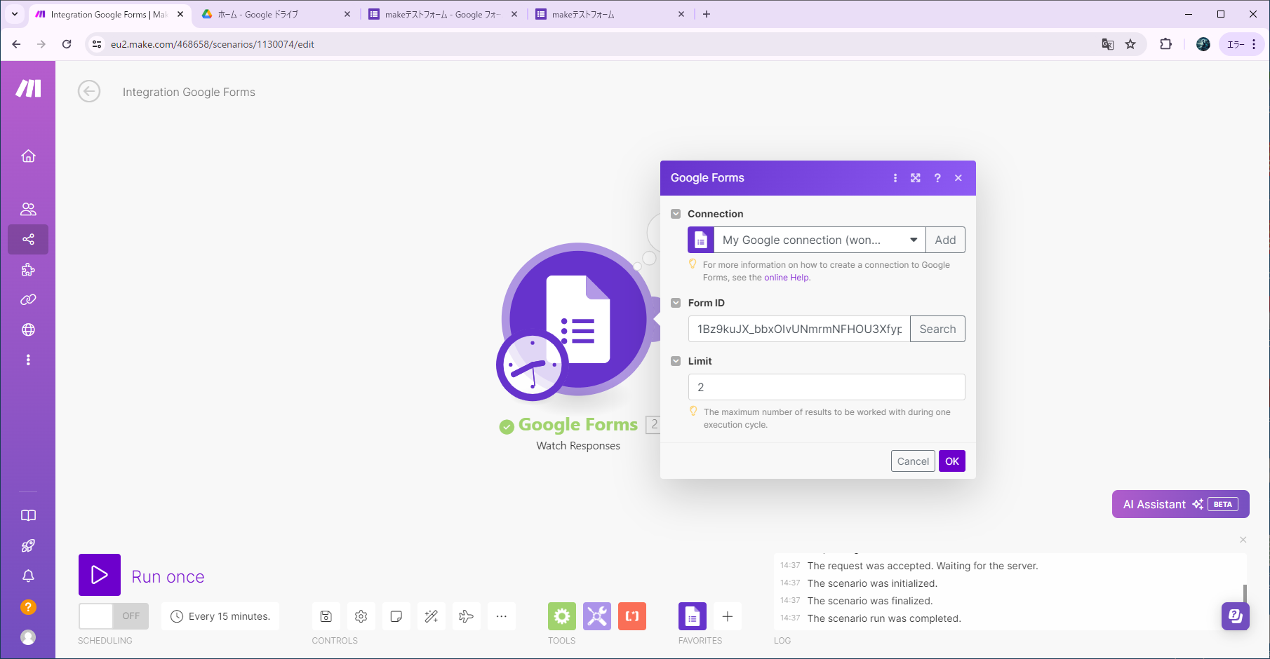 「送信」を押してGoogleフォームでの作業が終わったら、Makeを確認します。